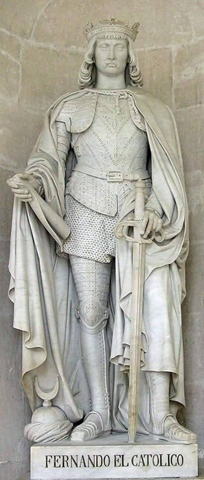 الصورة لتمثال فرناندو الثاني (1452 – 1516) ملك أراغون، ثم أراغون وقشتالة بعد زواجه من إيزابيلا ملكة قشتالة، وهو أول من تلقب بملك إسبانيا.