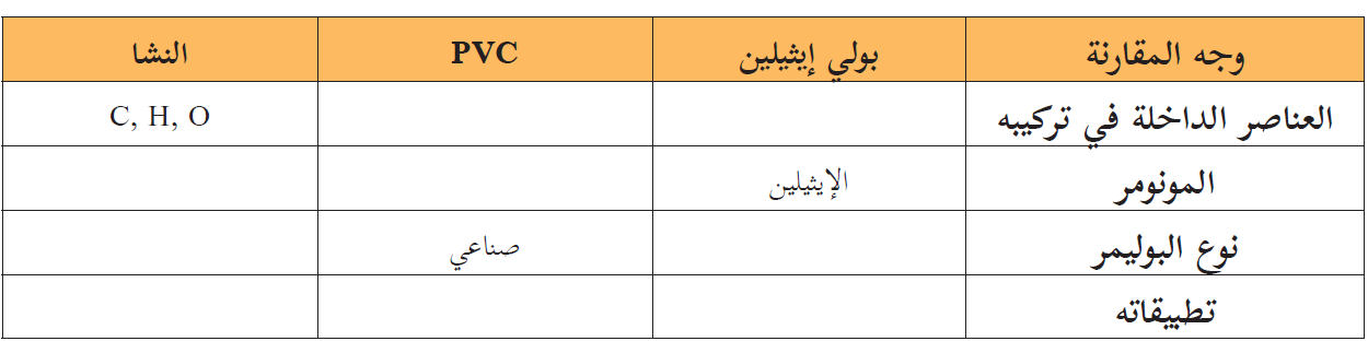 يمثل الجدول الآتي مقارنة بين بعض البوليمرات، ادرسه جيداً، ثم أكمل الخانات الفارغة:
