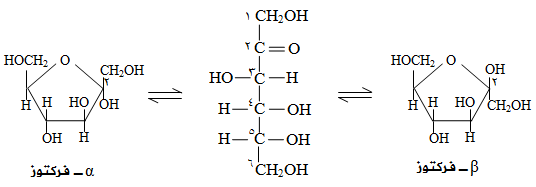 يوجد الفركتوز في المحاليل على شكل بناء مفتوح، وبناءان حلقيان، وجميعها في حالة اتزان، وينتج البناء الحلقي من ارتباط ذرة الكربون رقم (5) مع ذرة الكربون رقم (2)، ويسمى البناء الحلقي بناءً على اتجاه مجموعة (OH) على ذرة الكربون رقم (2)، فإذا كانت فوق مستوى الحلقة يسمى  β ـ فركتوز، وإذا كانت تحت مستوى الحلقة يسمى α ـ فركتوز.