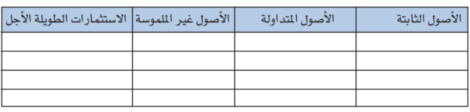 صنّف الأصول الآتية إلى: أصول ثابتة، وأصول متداولة، وأصول غير ملموسة، واستثمارات طويلة الأجل: