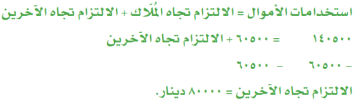 إذا علمت أن لمؤسسة الماجد التزامات تجاه المُلاك، قيمتها 60500 دينار، وأن مجموع استخداماتها للأموال بلغت 140500 دينار، فجد قيمة التزامها تجاه الآخرين.