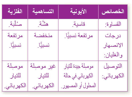 الفكرة الرئيسة: أذكر الخصائص الفيزيائية لكلّ من المواد الأيونية، والتساهمية، والفلزية.