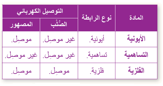 أقارن بين المواد الأيونية والتساهمية والفلزية كما في الجدول الآتي: