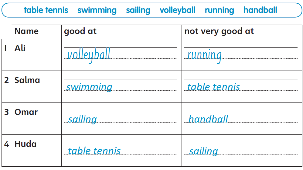 - My name's Salma. I’m good at swimming. I’m not very good at playing table tennis.