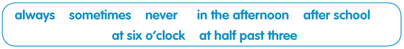 Suggested answer: I never play sports at six o’clock. I sometimes play sports at half past three.