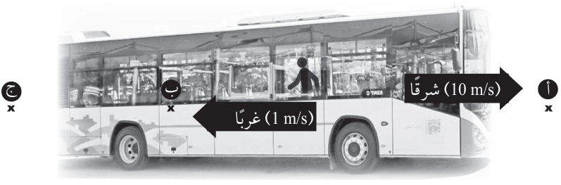 راكب يمشي بسرعة (1 m/s) نحو الغرب، داخل حافلة متحركة بسرعة (10 m/s) نحو الشرق، أصف حركة الراكب بالنسبة للنقاط (أ، ب، ج).