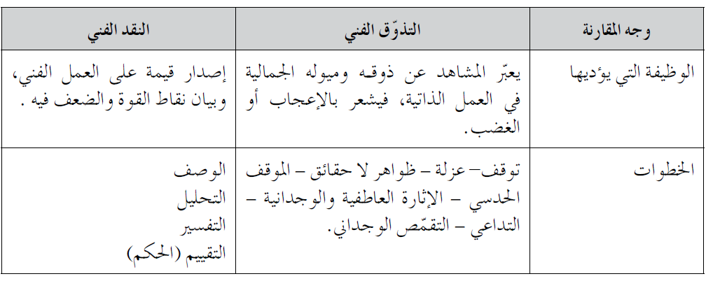 أولاً يتوقف المشاهد أمام العمل الفني، ويطيل النظر إليه، ثم يشعر المشاهد بالعزلة أمام العمل الفني، ويستبعد كل شيء من تفكيره باستثناء العمل، وبذلك يدرك أنه ماثل أمام ظواهر صورية وليس أمام حقائق، وبذلك يتحقق الإدراك الحدسي للمشاهد، والذي يعتمد على الحواس لا على البرهنة العقلية، فيثير العمل العواطف والانفعالات لديه، فتحدث الإثارة العاطفية والوجدانية، وقد يثير العمل في المشاهد عواطف قديمة تتعلق بما يشاهد من موقف، وتتداعى لديه الذكريات، ومع تعمق المشاهد في العمل الفني يتقمص الأدوار فيه محققاً علاقة بشرية تشبيهية تجعله يبتسم أو يحزن، وقد يطلق بعض التعبيرات الجسدية والكلامية تعاطفاً مع ذلك العمل، وبذلك تتم عملية التذوق.