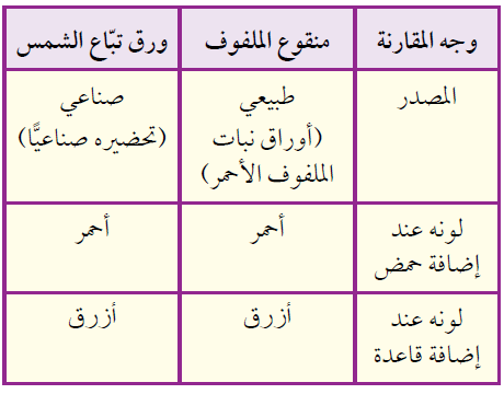 1- أقارن بين منقوع الملفوف الأحمر وورق تباع الشمس من حيث: مصدر كل منهما، وتأثير إضافة الحمض والقاعدة في لونهما.