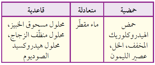 حمض الهيدروكلوريك المخفف، الخل، عصير الليمون، ماء مقطر، محلول مسحوق الخبيز، محلول منظف الزجاج، محلول هيدروكسيد الصوديوم.