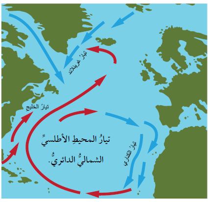 أ- أحدد: أي التيارات يحمل المياه الدافئة؟ وأيها يحمل المياه الباردة.