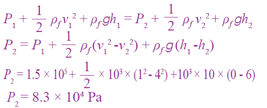 أستخدم المتغيرات: يتدفق الماء من ارتفاع 6 m عن سطح الأرض –باستخدام مضخة- عبر أنبوب متغير مساحة المقطع كما في الشكل، فإذا علمت أن مساحة مقطع الطرف العلوي للأنبوب 0.2 m2 ، وضغط الماء 1.5 x 105 Pa ومساحة مقطع الطرف السفلي للأنبوب 0.05 m2 ، وسرعة الماء فيه 4 m/s فأجد: