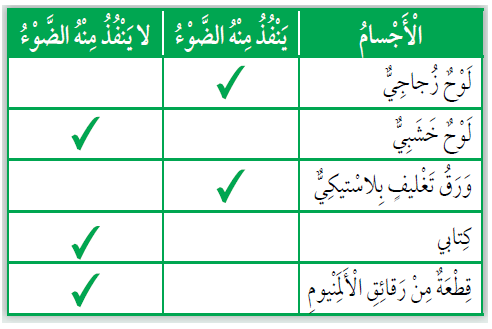 أصنف المواد تبعاً لمرور الضوء من خلالها.