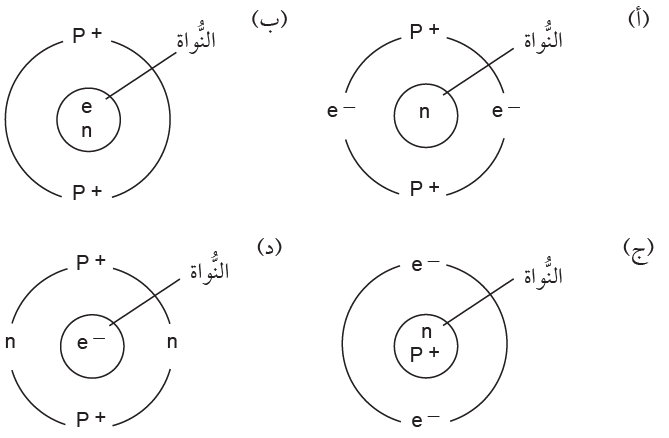 3- أيّ النماذج الآتية يمثل التوزيع الصحيح لمكونات الذرة؛ البروتونات (p)، والنيوترونات (n)، الإلكترونات (e)؟