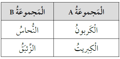 وضعت العناصر في مجموعتين، كما في الجدول أدناه. ما الخاصية التي أعتمدها في تصنيف العناصر الواردة في الجدول؟ أخطط لتجربة تدعم إجابتي.