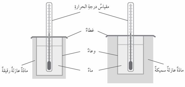 أجرى طلبة تجربة باستخدام الأدوات المبينة في الشكل. فوضعوا كمية الماء نفسها في وعائين متماثلين. غلف أحدهما بطبقة رقيقة من مادة عازلة، وخلف الآخر بطبقة سميكة من المادة العازلة نفسها. ثم قاس الطلبة درجة حرارة الماء في فترات زمنية متساوية.