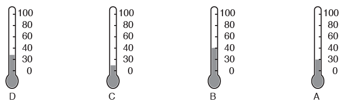 1- جرى استخدام أَرْبَعَةِ مَقاييس حَرارَةٍ مُخْتَلِفَةٍ لِقِياسِ دَرَجَةِ حَرَارَةِ الْمَاءِ فِي أَرْبَعَةِ أَوْعِيَةٍ زُجاجِيَّةٍ مُخْتَلِفَةٍ. أَيُّ مِقْياسٌ حَرارَةٍ يُشيرُ إِلَى الْمَاءِ الْأَكْثَرِ سُخونَةً؟