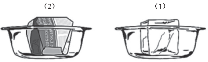 3- يُبَيِّنُ الشَّكْلُ أَدْنَاهُ قِطْعَتَيْنِ مِنَ الْجَلِيدِ، جَرى تَغْلِيفُ الثَّانِيَةِ بِوَرَقَةِ جَرِيدَةٍ، وَتُرِكَتِ الْأُولى مِنْ غَيْرِ تَغْلِيفٍ.