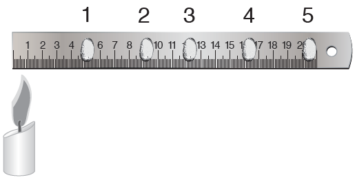 4- يُبَيِّنُ الشَّكْلُ شَمْعَةً تُسَخّنُ الطَّرَفَ الْأَيْسَرَ لِمِسْطَرَةِ فِلِزِّيَّةِ ثُبَتَتْ عَلَيْهَا حَبّاتُ فولٍ بِوَسَاطَةِ الزُّبْدَةِ.