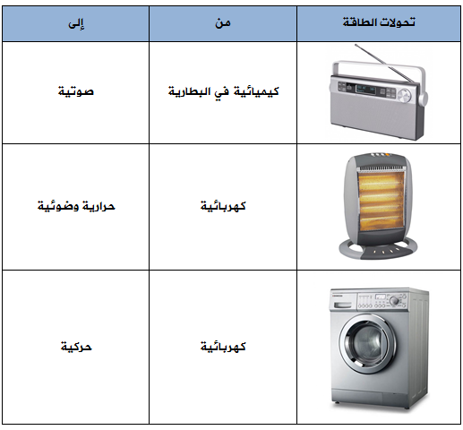 اكتب تحولات الطاقة في كل صورةٍ من الصور الواردة في الجدول الآتي: