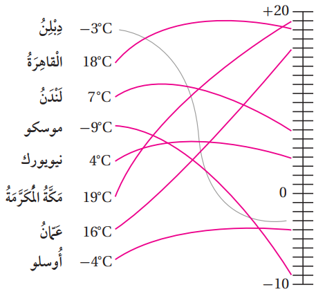 (5) أصل بخط بين درجة الحرارة في كل مدينة وموقعها على خط الأعداد: