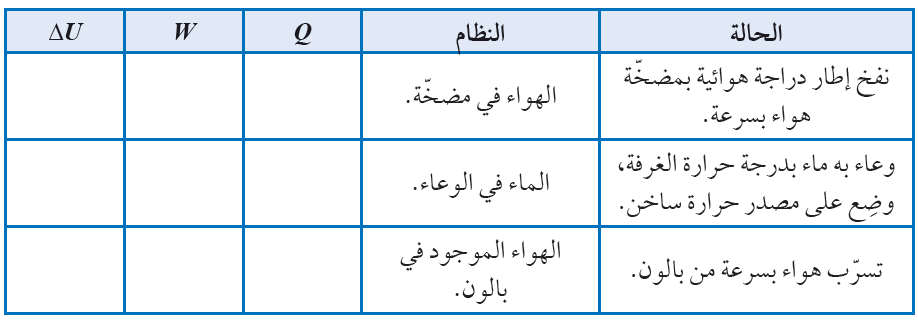 أحلل: أملأ الجدول أدناه بالرمز المناسب (0 , - , +) لكل من: Q و W و U في الأعمدة الثلاثة الأخيرة منه.