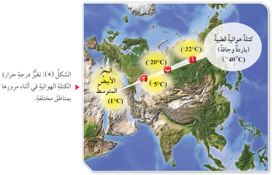 مستعيناً بالشكل (4)، أصف كيف تغيرت درجة حرارة الكتلة الهوائية الباردة والجافة، المتكونة فوق شمال قارة آسيا، في أثناء حركتها فوق المسطحات الساخنة، باتجاه منطقة حوض البحر الأبيض المتوسط.