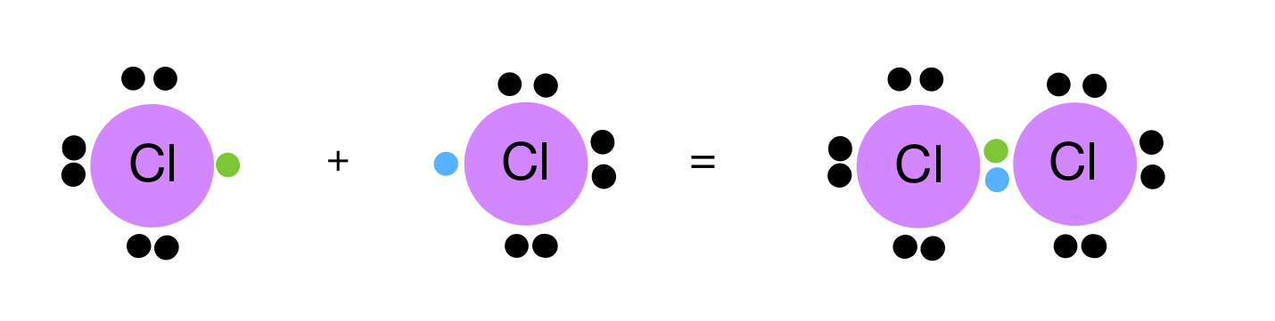ولكي يكتمل مستوى الطاقة الخارجي للكلور بالإلكترونات، وتصل إلى حالة الاستقرار، فإنها بحاجة إلى إلكترون، فتتشارك ذرة الكلور الأولى بإلكترون مع ذرة الكلور الثانية فتتكون بينهما رابطة تساهمية.