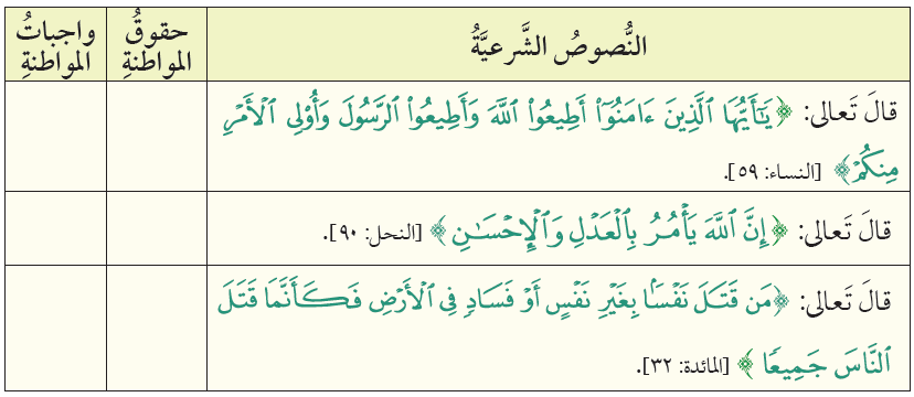 أصنف الأدلة الشرعية الآتية إلى ما يناسبها من حقوق المواطنة وواجباتها.