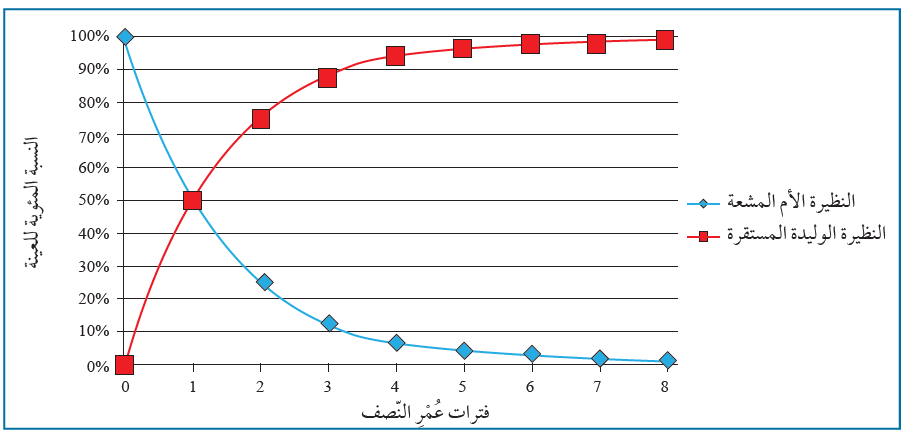 مع الزمن تقل كمية النظيرة الأم المشعة، وفي المقابل تزداد كمية النظيرة الوليدة بالنسبة نفسها.