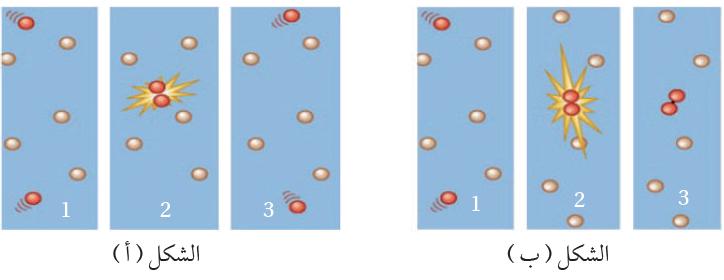 ألاحظ من الشكلين أنه حدث تصادم بين جسيمين متفاعلين، ولكن في الشكل (أ) ارتد الجسيمان عن بعضهما. أما في الشكل (ب) فإن الجسيمان ارتبطا ببعضهما؛ ما يدل على أنه حدث تصادم فعال، وأن العامل المؤثر هو توفر الطاقة الكافية للتصادم.