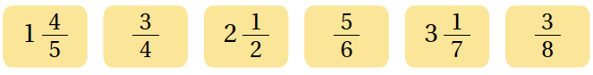 تحدّ: أختار من الكسور والأعداد الكسرية الآتية كسرين يُحققان المطلوب في السؤالين الآتيين: