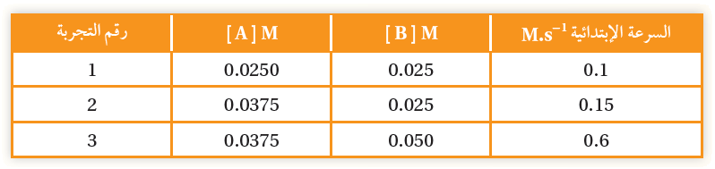 في التفاعل الافتراضي بين A و B عند درجة حرارة ثابتة؛ كانت بيانات التفاعل كما يأتي: