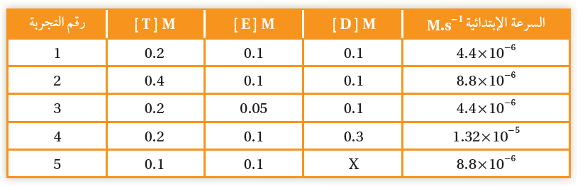 بتطبيق قانون السرعة على أي تجربة (مثلاً التجربة الأولى) وإيجاد قيمة ثابت السرعة (k)، ثم تعويضه في قانون السرعة وتعويض معطيات التجربة رقم (5).