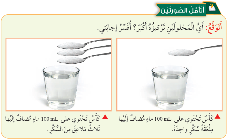 المحلول الذي في الكأس التي تحتوي على ثلاث ملاعق من السكر تركيزه أكبر؛ لأن نسبة السكر إلى حجم الماء أكبر من الكأس التي تحتوي على ملعقة واحدة من السكر.