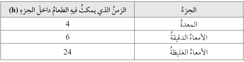 2- اعتماداً على الجدول الآتي فإن نسبة الزمن الذي يمكث فيه الطعام داخل الأمعاء الدقيقة من إجمالي زمن عملية الهضم: