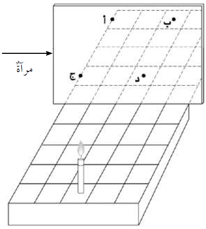 5- وُضعت شمعة على قاعدة ذاتِ خطوط متعامدة أمام مرآة كما في الشكل. عند أي نقطة سيظهر انعكاس الشمعة؟