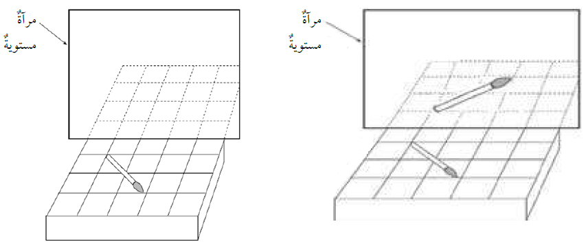 7- يُبينُ الشكل المجاور رسم فرشاة موضوعةٍ على رفّ أمام مرآة مستوية. أرسم صورة الفرشاة كما أراها في المرآة. لمساعدتي؛ أستخدم أنماط الخطوط المبينة على الرفٌ.