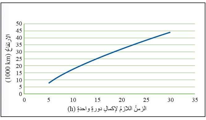 ب) أكتشفُ العلاقة بين ارتفاع القمر الصناعي، والزمن اللازم لإكمال دورة واحدة.