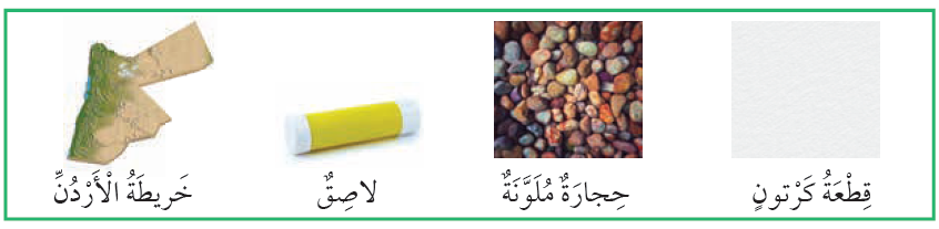 3- أَتَواصَلُ: أَلْصِقُ وَزَميلي/زَمِيلَتي قِطَعَ الْحِجَارَةِ الصَّغِيرَةِ الْمُلَوَّنَةِ عَلَى الْخَرِيطَةِ الَّتِي رَسَمْتُها؛ بِحَيْثُ يَتَشَابَهُ وَنَموذَجَ خَرِيطَةِ الْأُرْدُنُ - أَسْتَعِينُ بِمُعَلِّمي/مُعَلِّمَتي.