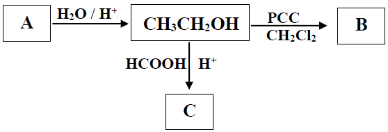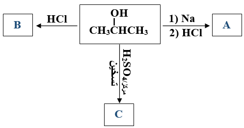 - يمثل المخطط المجاور سلسلة من تفاعلات المركبات العضوية التي ينتج عنها المركبات المشار إليها بالرموز (C , B , A)، ادرسه ثم أجب عن الفقرات (2، 3، 4).