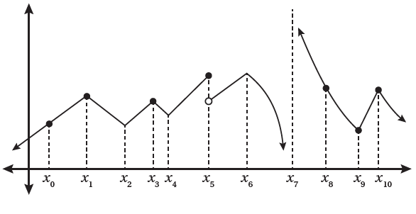 f غير قابل للشتقاق عند القيم x1, x2, x3, x4, x6, x9, x10 بسبب وجود زاوية لمنحنى الاقتران عند كل منها رغم أنه متصل.
