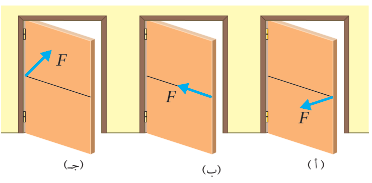 الشكل (ب): لا يفتح الباب؛ لأن خط عمل القوة يمرّ في محور الدوران وعزم القوة يساوي صفراً. صفراً.