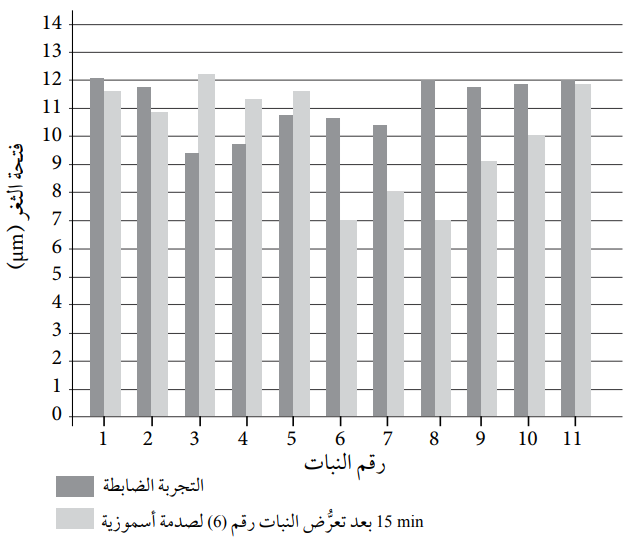 عرض النبات رقم (6) لصدمة أسموزية بإضافة محلول سكري (mannitol) عالي التركيز إليه، محاكاةً لأحوال الجفاف الطبيعية، ثم قيست فتحة الثغر في أوراق النباتات جميعها بعد نحو 15 min من الصدمة الأسموزية، علمًا أنّ هذا التجربة أُجريت جنباً إلى جنب مع تجربة ضابطة مشابهة لها من حيث عدد النباتات المستخدمة، والإجراءات المتبعة.