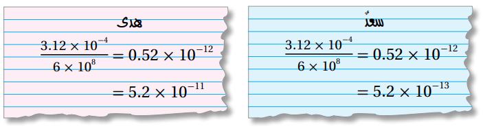 (19) أكتشف الخطأ: حل كل من سعد وهدى مسألة قسمة مكتوبة بالصيغة العلمية على النحو الآتي، من منهما حله صحيح ؟ أبرر إجابتي.