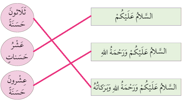أتأمل الحديث النبوي الشريف، ثم أصل بخط بين صيغة إلقاء السلام والأجر والثواب المناسب لها في ما يأتي: