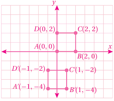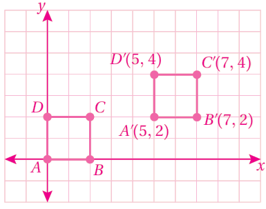 أرسم المربع الذي إحداثيات رؤوسه: (2 ,2)C A(0, 0), B(2, 0),، في المستوى الإحداثي، ثم أجد إحداثيات رؤوسه تحت تأثير الانسحاب المعطى في كل مما يأتي: