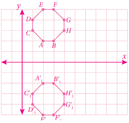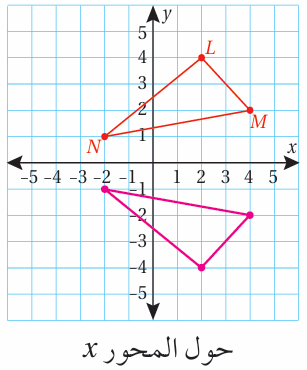 بعد ذلك أرسم صورة الإنعكاس له حول المحور x، ثم أكتب إحداثيات رؤوسه بعد عملية الإنعكاس.