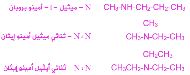 - تعتبر مجموعة الألكيل الأخرى المرتبطة بذرة النيتروجين مجموعة فرعية، وعند تسميتها يكتب قبل الاسم حرف N متبوعاً بشرطة (-N)، ثم اسم مجموعة الألكيل؛ أي أن مجموعة الألكيل هذه مرتبطة بذرة النيتروجين، وعند وجود مجموعتي ألكيل متشابهتين تستخدم البادئة ثنائي. والأمثلة الآتية توضح ذلك:
