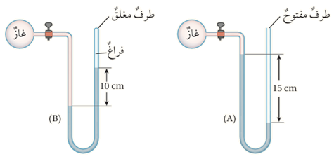 أستخدم الأرقام: أحسب مانوميتر زئبقي استخدم لقياس ضغط غازين مختلفين، مستعينًا بالبيانات المثبتة على الشكل، أحسب ضغط الغاز الذي يقيسه المانوميتر في الحالتين (A)، (B).