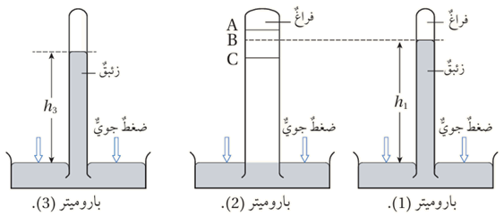 أ- أختار من الرموز (A, B, C) الرمز الذي أتوقع أنه يمثل ارتفاع الزئبق في أنبوب الباروميتر (2)، وأعطي دليلاً يدعم صحة إجابتي.
